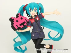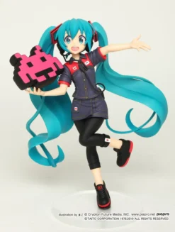 Hatsune Miku celebrates the classic world of retro gaming with this fun figure! The non-articulated figurine features the classic Vocaloid singing star wearing the Taito uniform and holding up a Space Invaders figure in her right hand.