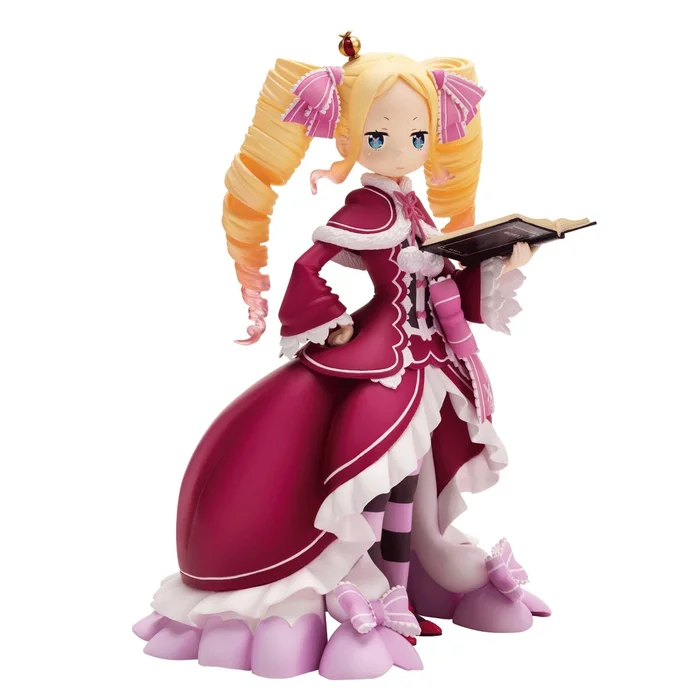 From Bandai comes this Ichibansho Figure of Beatrice from Re:Zero -Starting Life in Another World-. She measures 5.9” with one hand on her hip and the other holding open a book while she stares at you looking slightly perturbed. Highlights include the semi-translucent pink tips of her coiled pigtails and fringe around her face, fine paintwork of her butterfly pupil eyes, and expert sculpting of her voluminous and ruffled dress which is well shaded for a realistic look. Of course, her hair is topped with a little shiny gold and red crown. Add her to your collection, preferably next to some books or perhaps atop one!