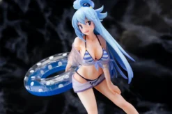 Sometimes, a bishoujo figure’s ensemble just makes too much sense. Here we have Aqua-sama, goddess of water, gussied up in swimwear and holding an inflatable pool toy! There are plenty of lovely details found in this 1/7 scale figure from KonoSuba’s most…useful character! Completely carefree and in her element, Aqua dazzles us with her loose fitting top that’s falling off her shoulders and her unbuttoned short shorts. These articles of clothing easily reveal her blue and white striped string bikini underneath. Behind her, she props up a matching blue and white donut with her derrière. And with that joyful look on her face you can read her mind. She’s obviously thinking, “Screw work today, it’s playtime!”