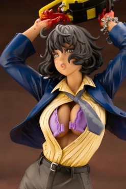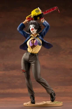 Measuring 9.8″, Leatherface is re-imagined as a beautiful woman wearing his familiar outfit though it is snug to her shapely form and has the addition of a lilac bra with a burst front clasp. Her lost and crazed expression has been beautifully painted and her disheveled, curly hair carefully sculpted. A clear highlight is her bloodied hands and chainsaw which were created by turning data from the film into 3D form and adjusted to the size of the statue. Even the smallest details have been created such as the tear on the front of Leatherface’s pants from when his chainsaw landed on his leg after being thwacked with a wrench in the face.