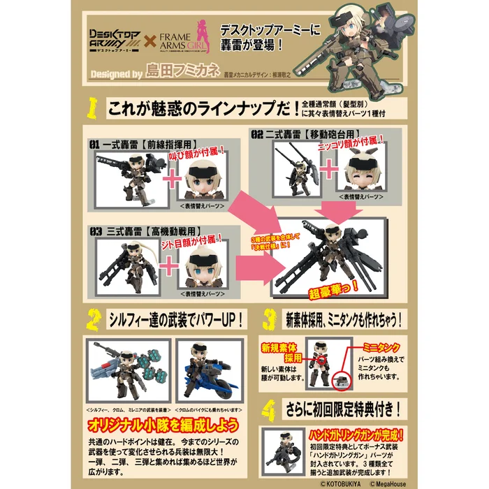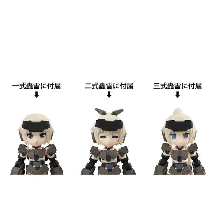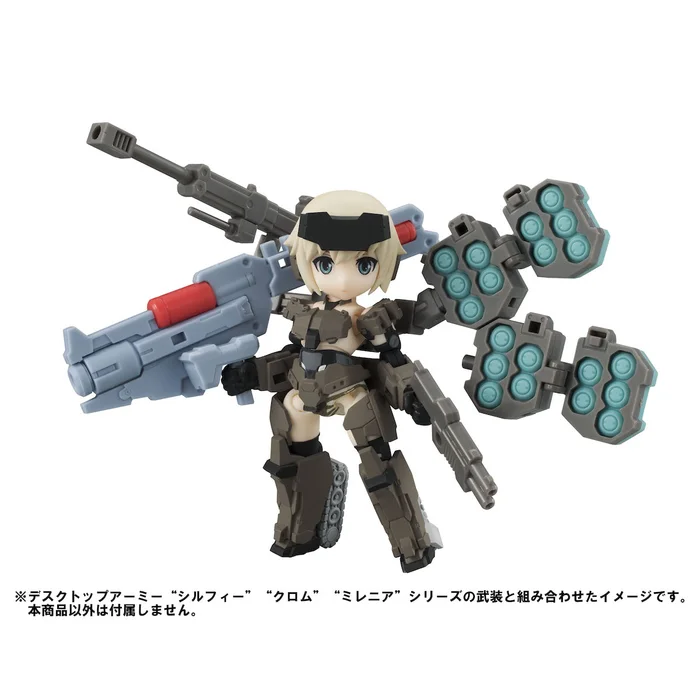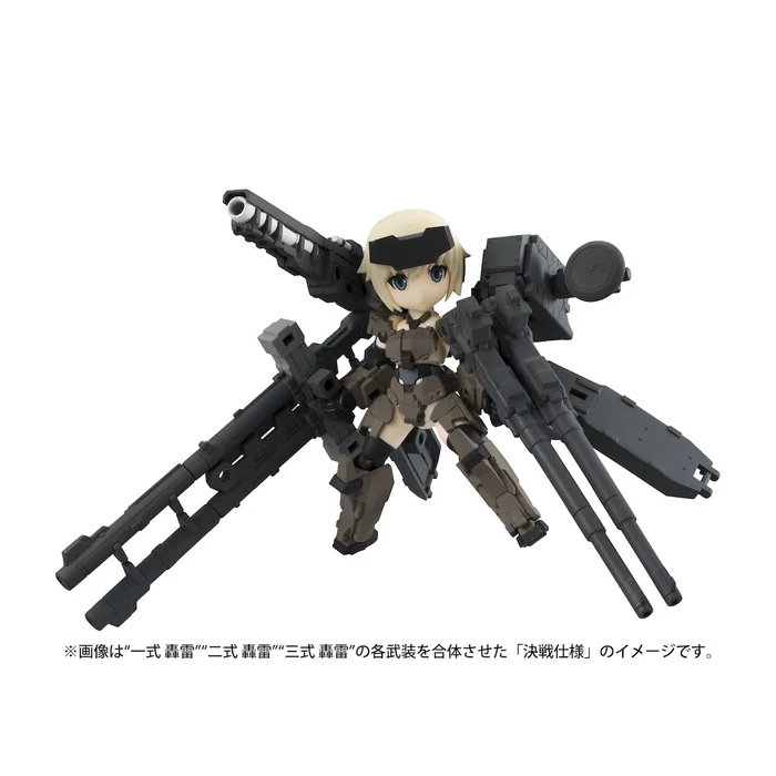 Gourai brings some of her firepower to your Desktop Army in this adorable 3.1” articulated minifigure! A collaboration between MegaHouse and the Frame Arms Girl series, Gourai is inspired by an illustration by Fumikane Shimada and comes with a selection of weapons and interchangeable faces compatible across the Desktop Army series. There are three different versions to collect including Front Line Gourai, Mobile Gun Battery Gourai, and High Maneuver Warfare Gourai.