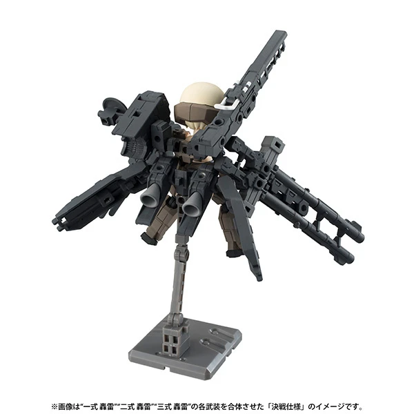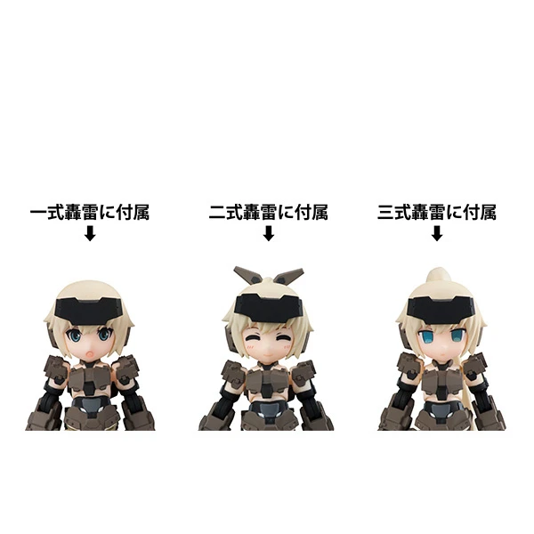 Reinforce your Desktop Army with this three-figure KT-321f Frame Arms Girl Gourai Series Box Set! The set includes the 1st Gourai for front commander, 2nd Gourai for mobile gun battery, and 3rd Gourai for high maneuver warfare. Each of the painted, articulated, non-scale figures stands 3.1” and comes with interchangeable faces as well as a special bonus Gatling gun.