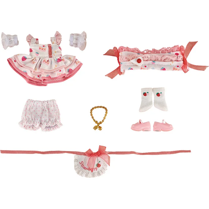 Now your Nendoroid Doll can look pretty in pink with this tea time-inspired outfit set! Made of real fabric, the strawberry shortcake-themed set includes a hairband featuring a piece of cake, a frilly dress, apron, balloon sleeves, pumpkin pants, socks, necklace, and strap pumps with magnetic soles.