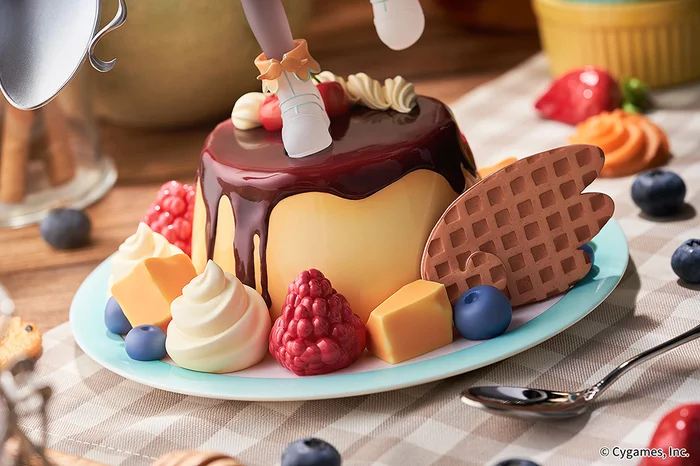 Ribose introduces a Princess Connect! Re:Dive collectible that proves to be utterly delectable! This Miyako Izumo It’s Snack Time figure is a 1/7 scale dream that measures 11.8″ tall. Miyako-chan is lifting her leg with both arms up in a cheerful pose. Her hand is holding an enchanting large spoon featuring delicate ribbon tails. Miyako’s sleeves and skirt are finely detailed with multiple layers of ruffled fabric, while her hairstyle splashes around aqua blue color! For a base, Miyako is standing on a giant custard pudding cake slathered in shiny chocolate syrup, surrounded by fruits and confectionary desserts all on top of a plate! The food looks so delicious that a second face plate is included to show Miyako with her cheek full of yummy treats!